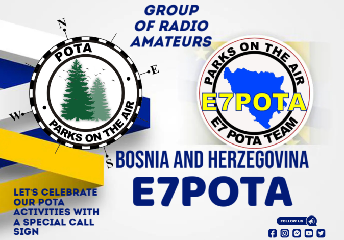 Prvi puta Grupa Radio Amatera iz cijele Bosne&Hercegovine i drugih zemalja skupa organizira specijalni pozivni znak E7POTA sa ciljem da napravi odličnu promociju naše zemlje u svijetu radioamaterizma.Potražite nas u eteru,javite se na naš pozivni znak,podijelite našu radost... Cijeli team iz E7 želi vam 73 44 !!!